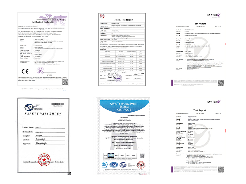 Our candles are manufactured to meet international quality standards, and each batch is tested for safety, burn time, and scent consistency. Testing reports can be provided upon request.